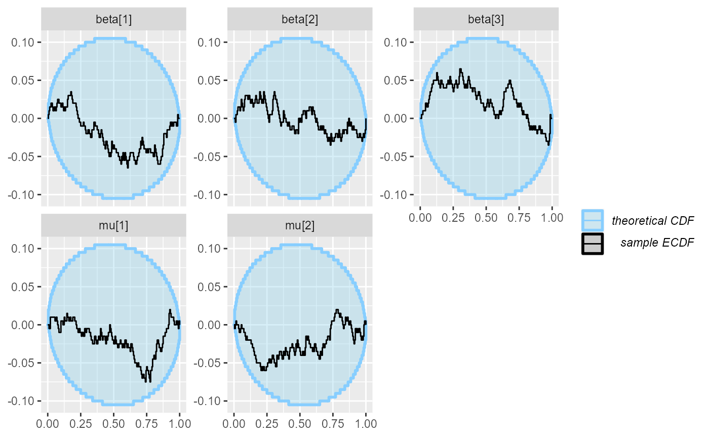 This actually shows a limitation of the coverage results - for mu[2] the approximate CI for coverage excludes exact calibration for a bunch of intervals, but above we see that the more trustworthy plot_ecdf_diff is not showing a problem (although there is some tendency towards slight underdispersion).